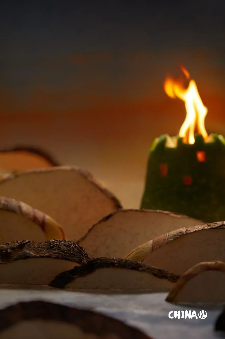 (芋头雕刻灶台,水缸,藕片做锅灶,干猴头菇当柴火,小番茄当做壶。)