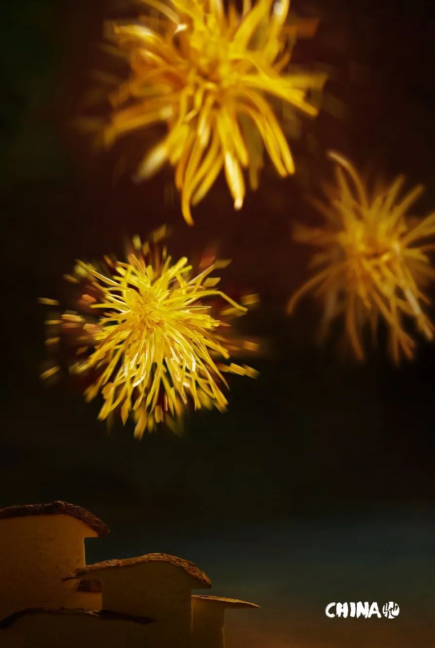 (芋头做图片下方的房屋群,空中的烟花为韭黄。)