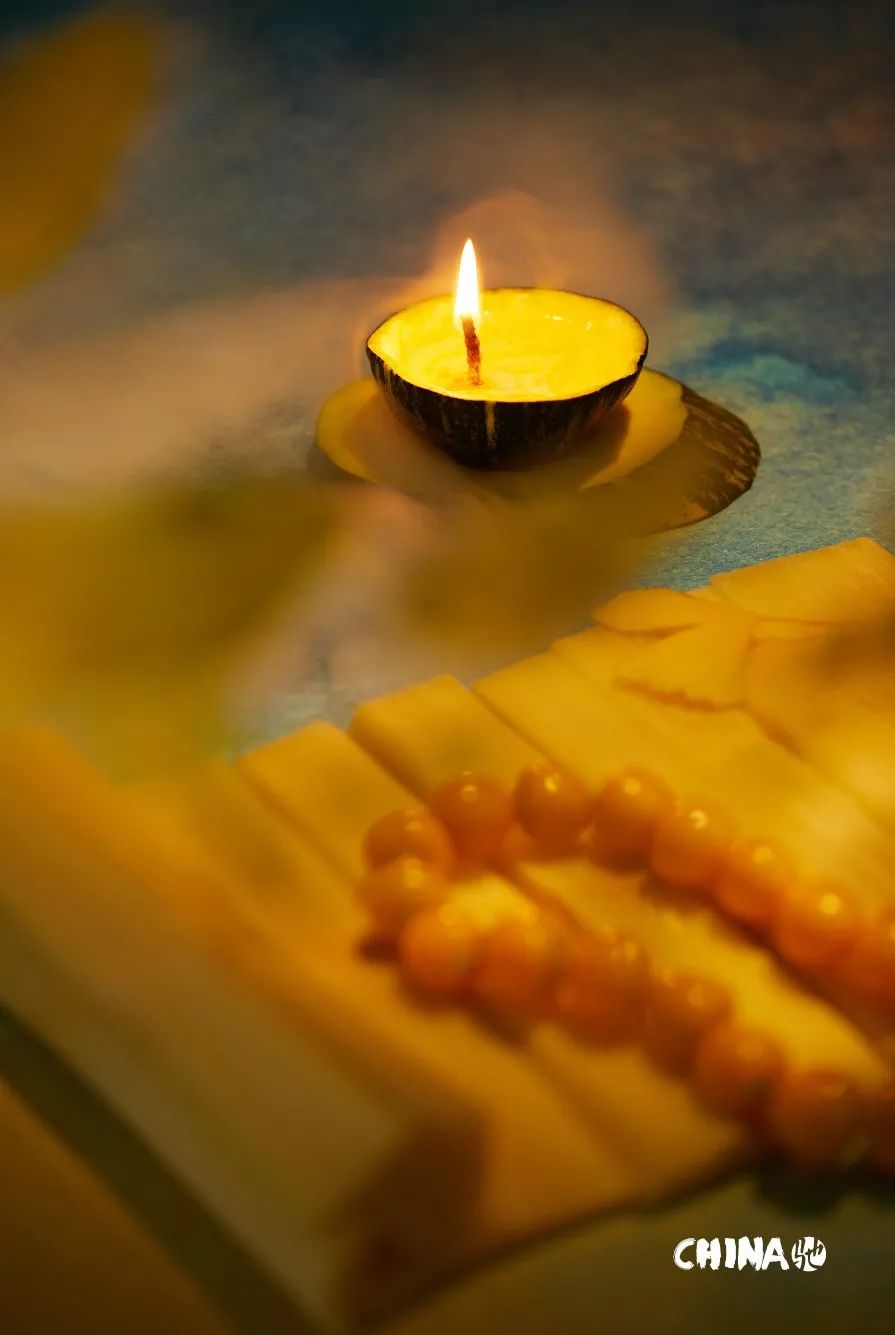 (甘蔗去皮后切片摆放代替竹简,姑娘果串成佛珠,南瓜切开掏空果肉岛上蜡油灯芯做蜡烛。)