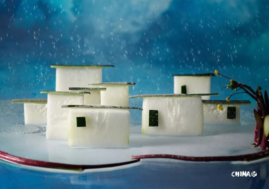 (冬瓜肉和冬瓜皮搭制徽派建筑,紫菜苔做古树。)