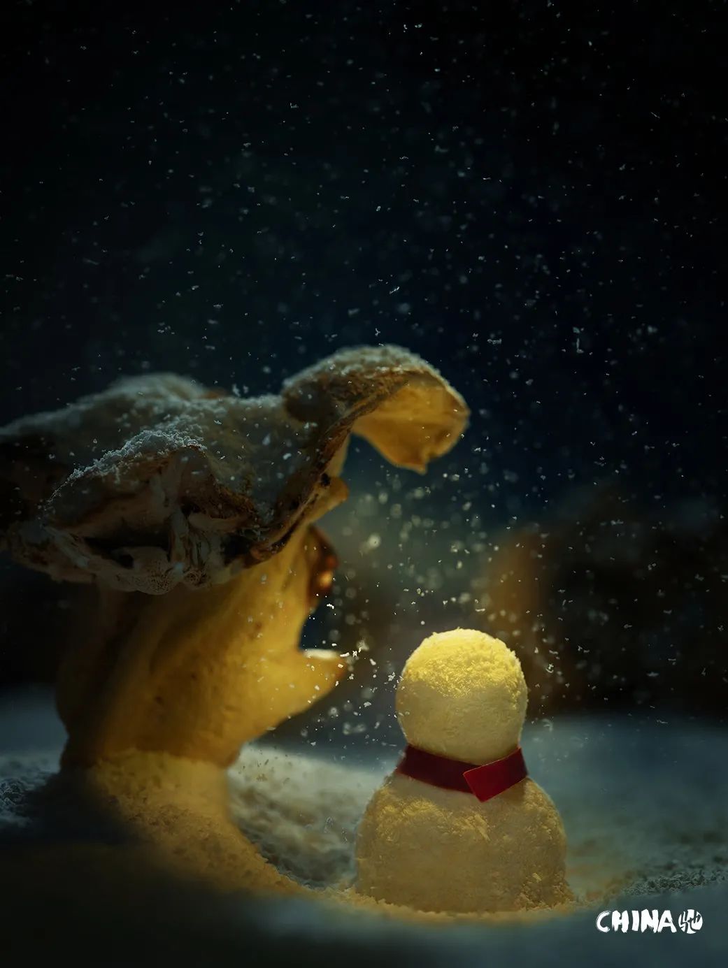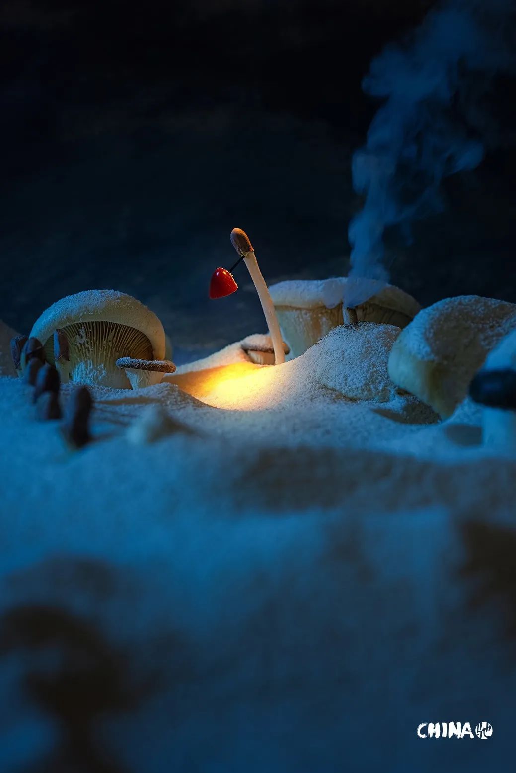 (面粉椰蓉模拟雪乡的环境,各种菌菇类来做雪屋和粮仓,花生芽做灯杆,番茄尖做灯笼。)