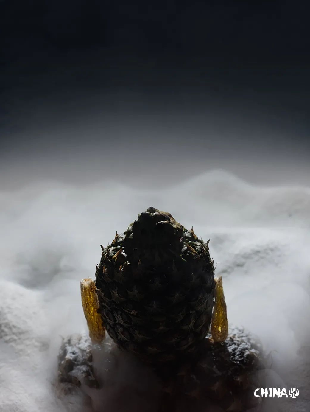 (椰蓉造景做成起伏的山川,将菠萝切割制作佛头和佛身,用竹荪做佛祖的双耳,干冰营造出云雾缭绕的意境。)
