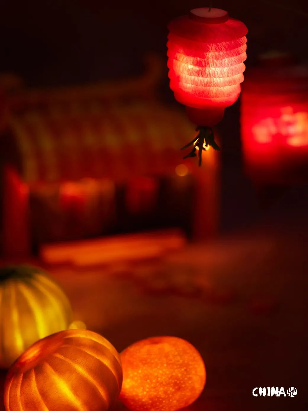 (南瓜用刀划出檐纹理感,大芋头切块当大门,门上对联用心里面萝卜切割并用牙签固定而成,台阶为南瓜条,石子路为胡萝卜切片,萝卜和橘子掏空方便透光做灯笼。)