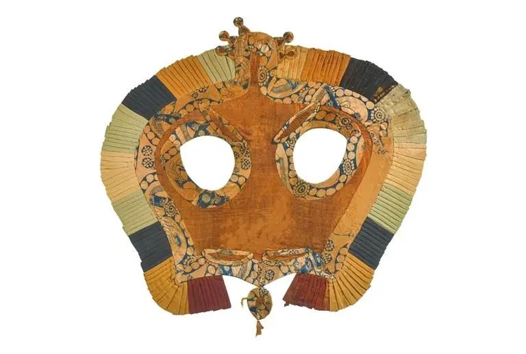 坐骑专用,是尊贵地位的象征。来看看这件以布帛锦绢缝缀的马覆面,虽然不全是用真丝制成的,但其做工装饰却极其精美考究。