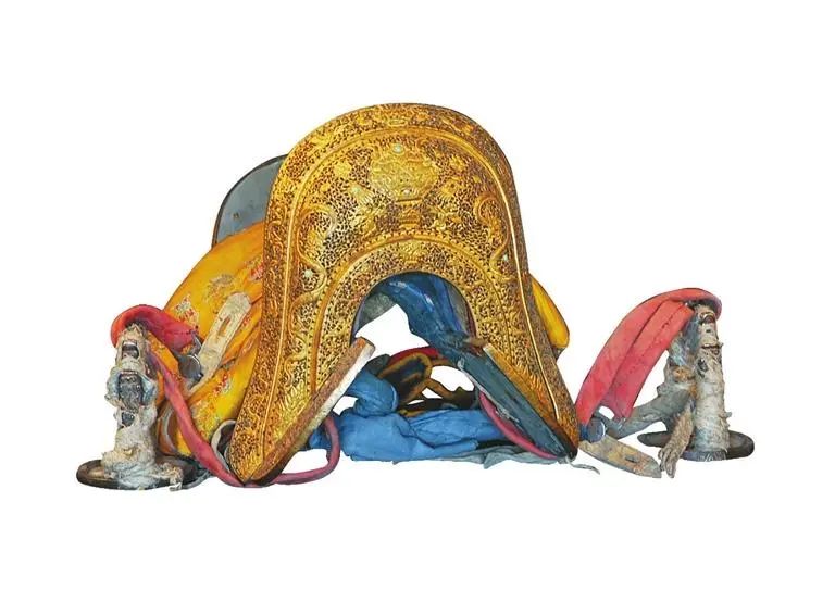 有,甚至可以比我们想象的还要华丽。且看甘肃省博物馆收藏的清代“鎏金刻纹马鞍”,看到这只马鞍的华贵造型、精湛工艺,你就知道仅仅用“金雕鞍”这个词来描述都算是词穷了。甘博的这只马鞍是真正的金雕鞍,主体自然是木质,可前后桥及外露的护板上镶嵌着鎏金的银饰,镂刻着精美的云龙花草图案,龙额龙口等地方甚至镶嵌着绿松石。这只马鞍如此的精细优美,真让人叹为观止!