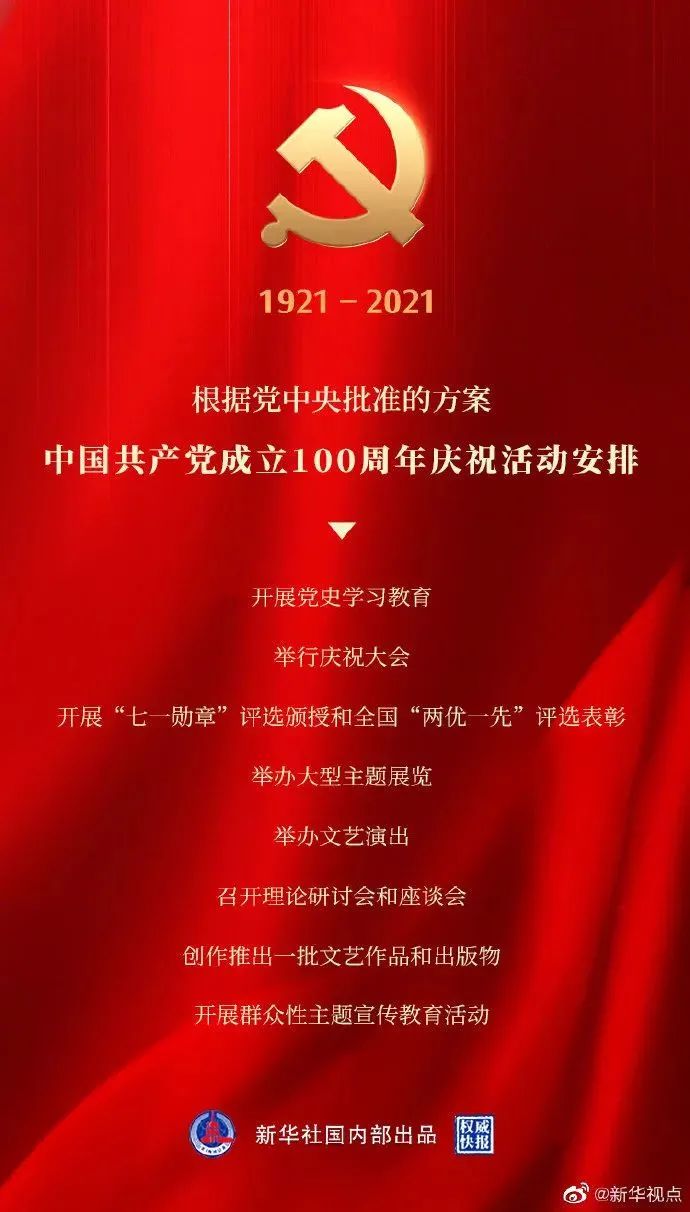 3月23日上午,中共中央举行新闻发布会,介绍中国共产党成立100周年庆祝活动有关情况。会上,中央宣传部分管日常工作的副部长王晓晖介绍,我们将以中共中央名义,隆重举行庆祝中国共产党成立100周年大会,中共中央总书记、国家主席、中央军委主席习近平将发表重要讲话。王晓晖介绍,根据党中央批准的方案,庆祝活动主要包括开展党史学习教育、举行庆祝大会、开展“七一勋章”评选颁授和全国“两优一先”评选表彰、举办大型主题展览、举办文艺演出、召开理论研讨会和座谈会、创作推出一批文艺作品和出版物、开展群众性主题宣传教育活动八项内容,确保庆祝活动隆重热烈、务实节俭、安全有序。