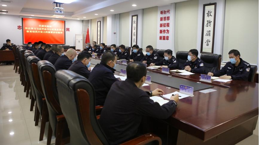 天津市监狱组织全体警察传达学习习近平总书记在党史学习教育动员大会上的重要讲话精神。