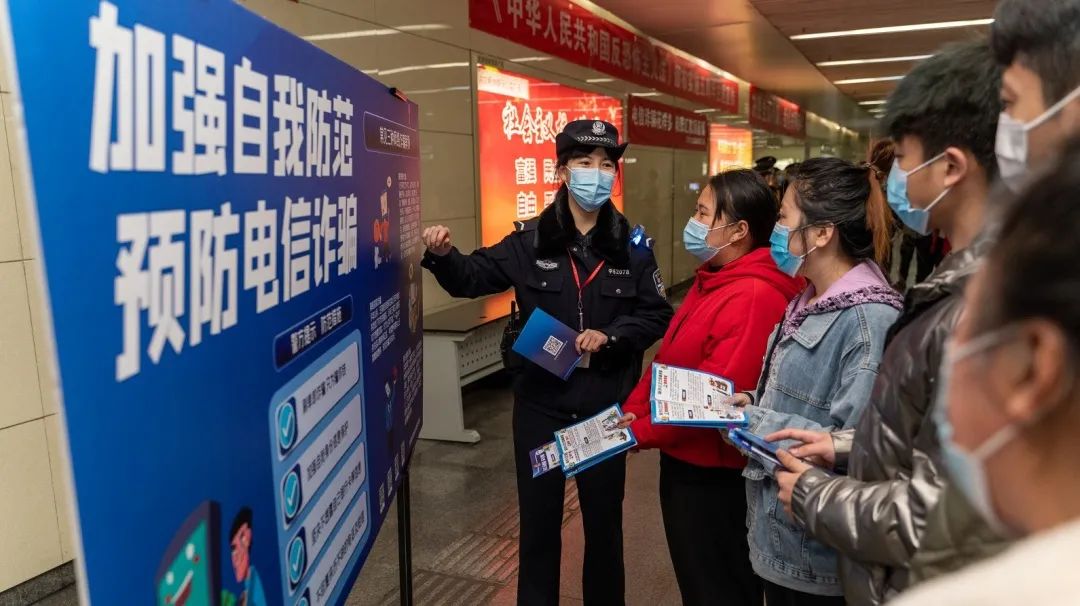 市公安局公交总队民警在地铁站开展防电诈宣传。