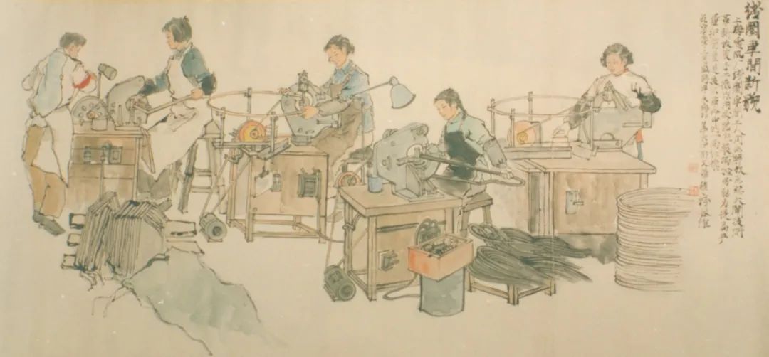 《线圈车间新貌》 应野平 朱梅邨 姜大中 郁文华 程十发 纸本设色 1960年 68×178cm