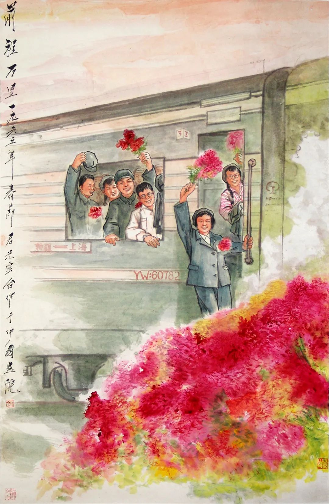 《前程万里》由程亚君、谢之光和唐云三人于1965年合力创作,清晰可见“前程万里 一九六五年春节 君光云合作于中国画院”的字样。1959年,为加快新疆建设步伐,缩小城乡差距,随后便引起了城市知识青年到农村与边疆垦荒的热潮。国内各地的知青响应国家号召,支援新疆建设,意在广阔天地中,大有作为。热忱的青年怀揣远大前程,以上海为出发地,奔赴新疆,奔赴祖国最需要的地方。在这幅作品中,前景红花锦簇,笔墨大气,层次丰富,彰显着年轻人的热血青春。中景则是由上海开往新疆的列车。在这趟列车上,一群雄姿英发的知青们挥舞着鲜花,心潮起伏,满怀希望地踏上了从上海到新疆支援建设的旅程,给新疆这片土地带去了知识与繁荣。此幅作品运用当代绘画媒介,传统与创新相结合,紧扣时代脉搏,对支援新疆的知青致以崇高的敬意,彰显了极强的时代性。