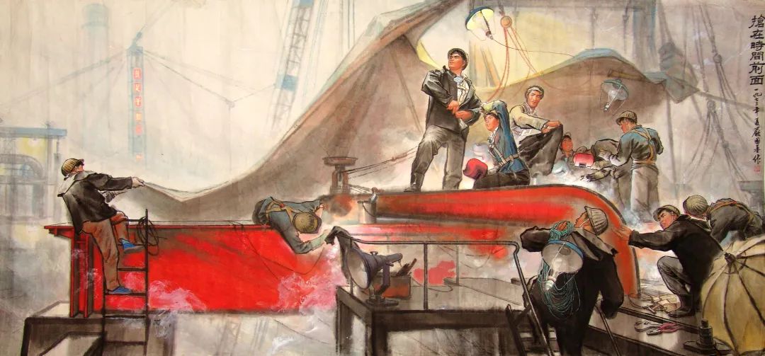 《造船组画之抢在时间前面》 严国基 纸本设色 1973年 135×297cm