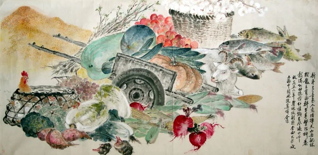 《农业大丰收》是上海中国画院画师为庆祝农林牧副渔全面大丰收而集体创作。画中农产品非常大,种类也十分齐全,正如画面右下角的题诗“新年多喜气,人意指挥天。山岳献林树,龙王贡海鲜。牛羊繁好种,黍谷满公田。扬我红旗帜,东风遍大千。”为了突出大丰收这一场面,画家们将物象进行主观处理,将物体夸张放大。近处的板车及上车的农产品与远处的鱼羊以墨线勾勒,淡墨晕染,其余大部分物体如公鸡、葡萄、萝卜和棉花等以没骨法直接画出,色彩通透。画面虽物品繁多,但整体并不拥挤,整体色彩清新淡雅,前后物体遮挡关系清晰明确,空间远近显而易见。在整体构图方面,左下角的题跋与右上角的黍谷成对角线呼应,既保持画面平衡感,又凸显中间主体部分。