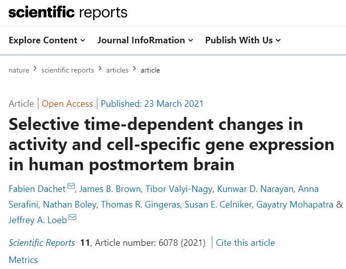 该研究发表在《Scientific Reports 》期刊上,题为“Selective time-dependent changes in activity and cell-specific gene expression in human postmortem brain”。