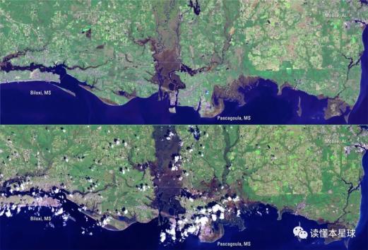 ▲卫星图片显示,卡特里娜飓风过后,洪水对密西西比州沿海地区的破坏以上就是地理气候给东亚大陆跟北美大陆造成的区别,东亚大陆恰恰能获得两种气候因素的好处,冬季的寒潮一方面在冬季给农业保存了水分,一方面起到杀菌作用,同时由于地形的阻隔,它又不像北美的寒潮那么极端。