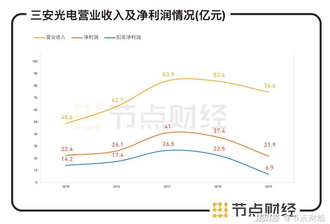 财报显示,2015年-2019年,三安光电营业收入分别为48.6亿、62.7亿、83.9亿、83.6亿、74.6亿;同期,三安光电的净利润分别为22.4亿、26.1亿、41.0亿、37.4亿、21.9亿;2015年-2019年,三安光电扣非净利润为14.2亿、17.4亿、26.5亿、22.5亿、6.90亿。