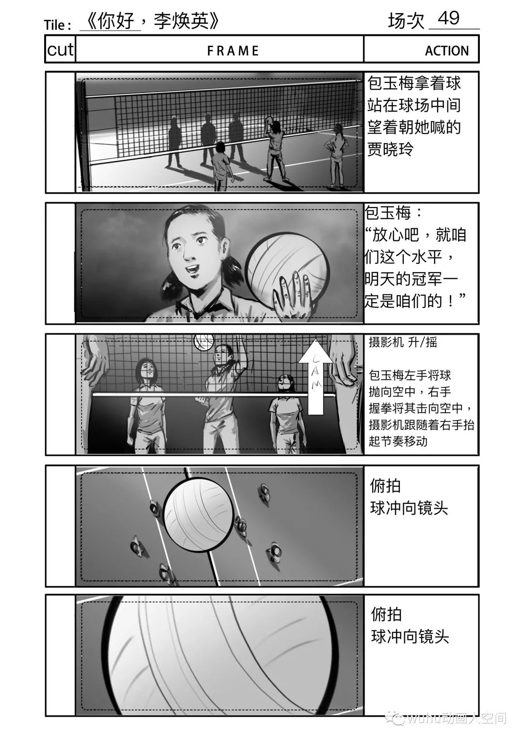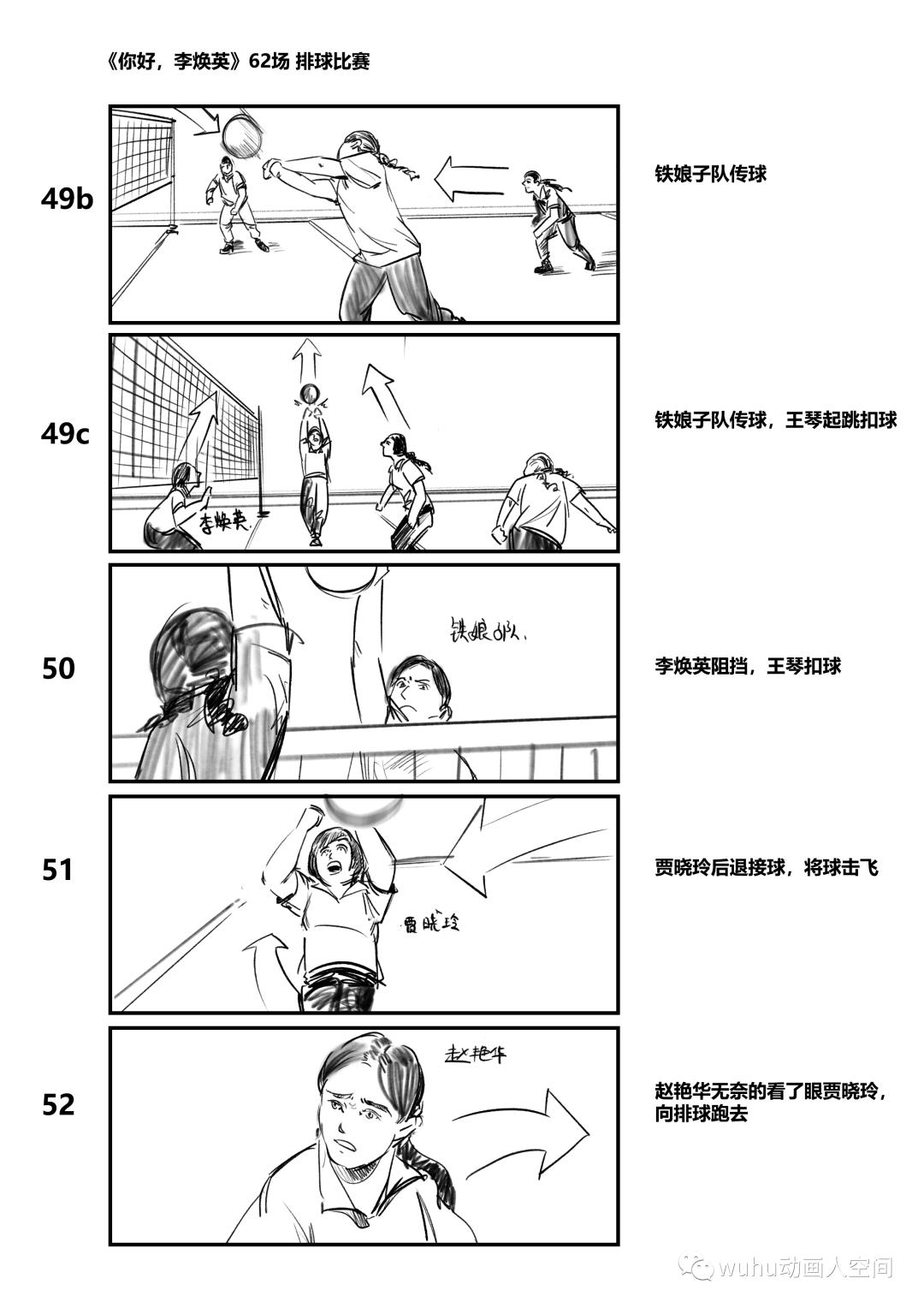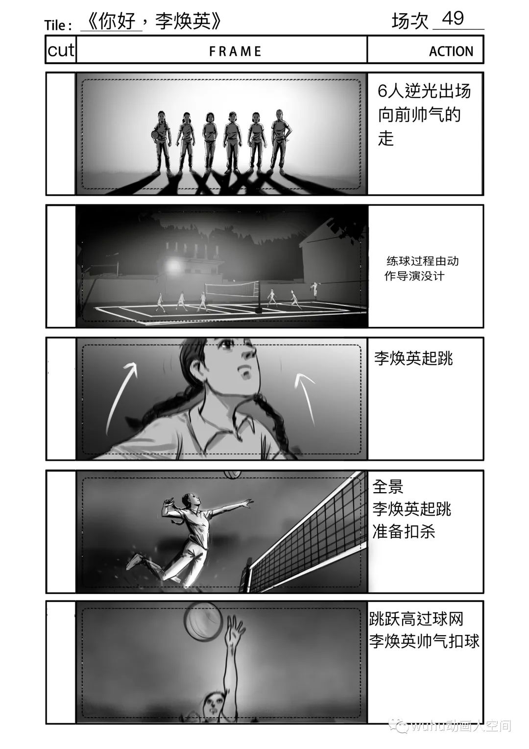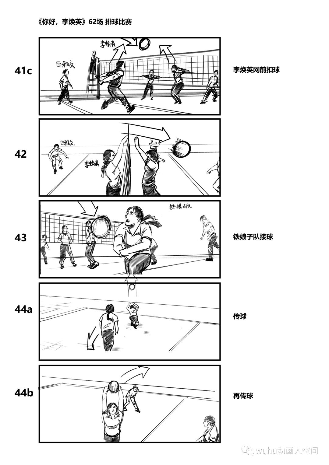 排球比赛是影片中唯一的动作戏,导演对那场戏的要求很高,基本上有将近一个月我是跟着动作指导交流和制作排球比赛的分镜,动作指导试拍拍了三版,我分镜也跟着改了三版,在大的方向决定后就是扣细节,因为从剧情上来说主角队最后是要大比分落后对方队伍,每队人在一次得分中都做了什么动作,都得设计的清清楚楚,因此在好几个得分点上,分镜前前后后改了好几个版本。在画这场戏分镜的时候,我自己的创作空间比较少,因为我不懂排球的战术,动作指导比我更加清楚这场戏的动作和镜头的设计,创作过程一般是动作指导在描述每个镜头,我在旁边快速记下,这场分镜的要求是简洁清晰,并以最快的速度出图。拍摄当天就按分镜进行摄制,因此剧组能在较短的时间内完成大量动作戏拍摄。
