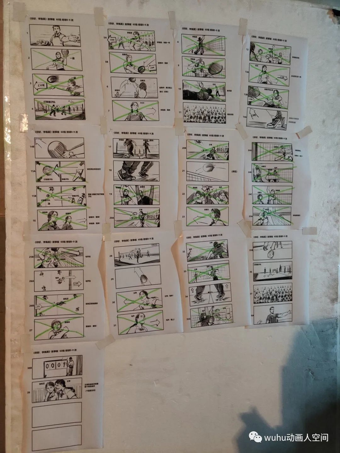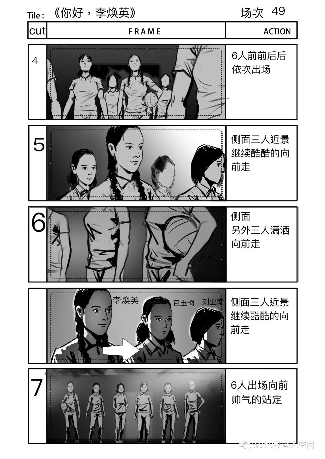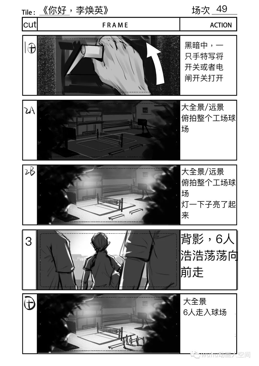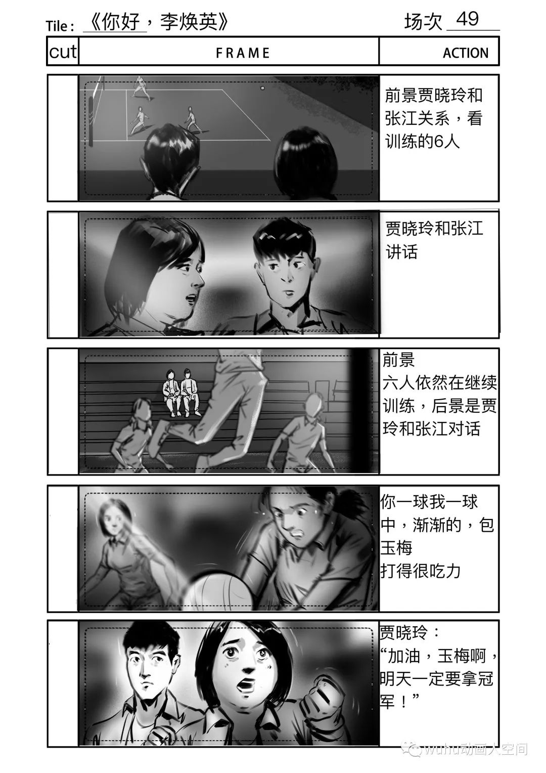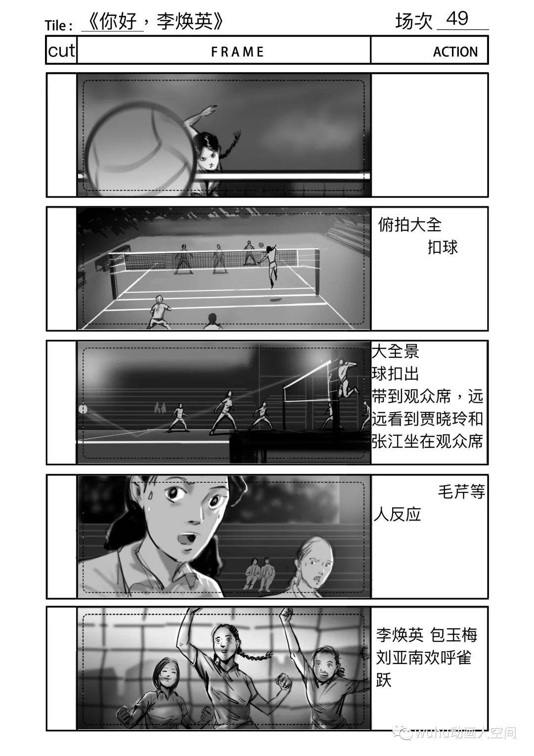 排球比赛是影片中唯一的动作戏,导演对那场戏的要求很高,基本上有将近一个月我是跟着动作指导交流和制作排球比赛的分镜,动作指导试拍拍了三版,我分镜也跟着改了三版,在大的方向决定后就是扣细节,因为从剧情上来说主角队最后是要大比分落后对方队伍,每队人在一次得分中都做了什么动作,都得设计的清清楚楚,因此在好几个得分点上,分镜前前后后改了好几个版本。在画这场戏分镜的时候,我自己的创作空间比较少,因为我不懂排球的战术,动作指导比我更加清楚这场戏的动作和镜头的设计,创作过程一般是动作指导在描述每个镜头,我在旁边快速记下,这场分镜的要求是简洁清晰,并以最快的速度出图。拍摄当天就按分镜进行摄制,因此剧组能在较短的时间内完成大量动作戏拍摄。