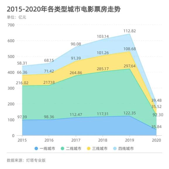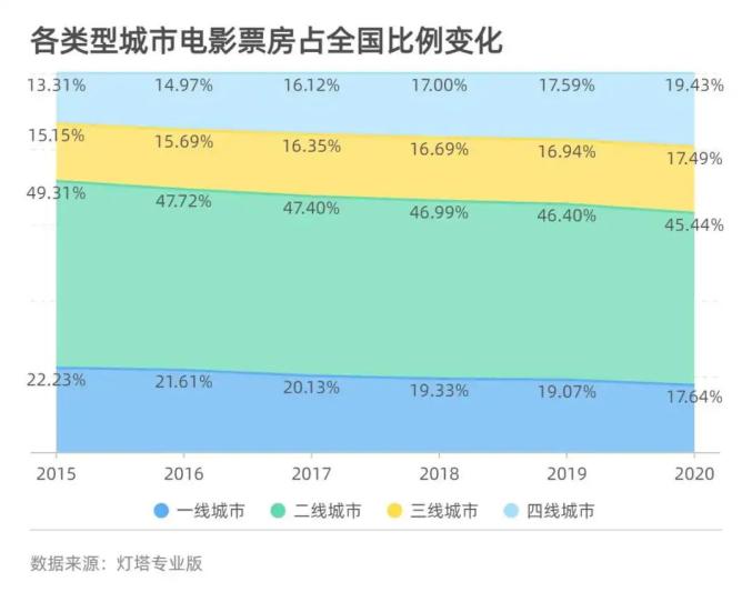 四线城市的两个指标则出现“双降”,影院数量占比从2015年35.83%降至2020年33.39%,银幕数量占比则从2015年29.02%降至2020年27.42%。