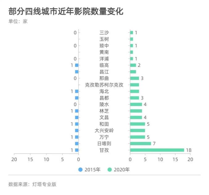 同一时期,还有不少四线城市拥有的影院和银幕呈个位数。比如,2015年四川甘孜、海南文昌、西藏日喀则等11个城市只有唯一一家影院。其中,甘孜、文昌和西藏昌都全城也只有唯一一块银幕。