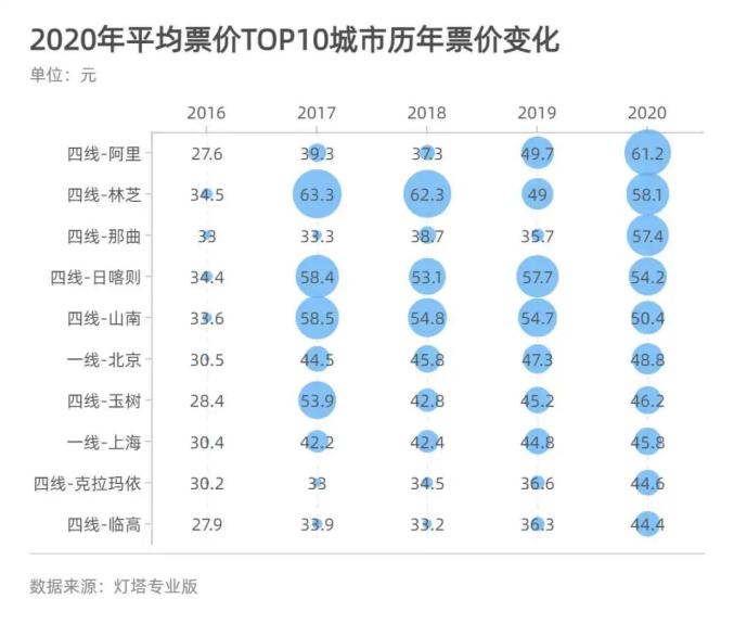 最典型的例子是西藏阿里。2020年,这个只有2家影院、1块银幕的地区,平均票价突破60元,全国最高。而且,阿里历年平均票价都不低,2015年平均票价就达到42.7元。对比发现,当北京、上海、广州、深圳的平均票价还在40-50元区间时,诸如林芝、山南、日喀则、昌都、凉山、玉树这些城市的平均票价已突破50元大关。