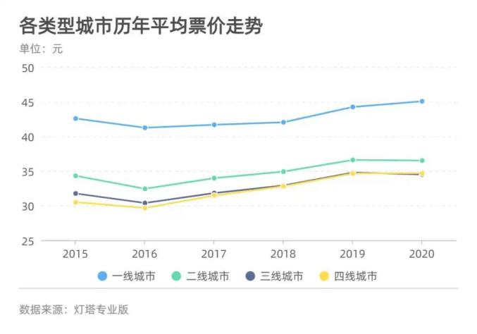 另一个数据可以佐证三、四线城市的“潜力”所在,即平均票价。