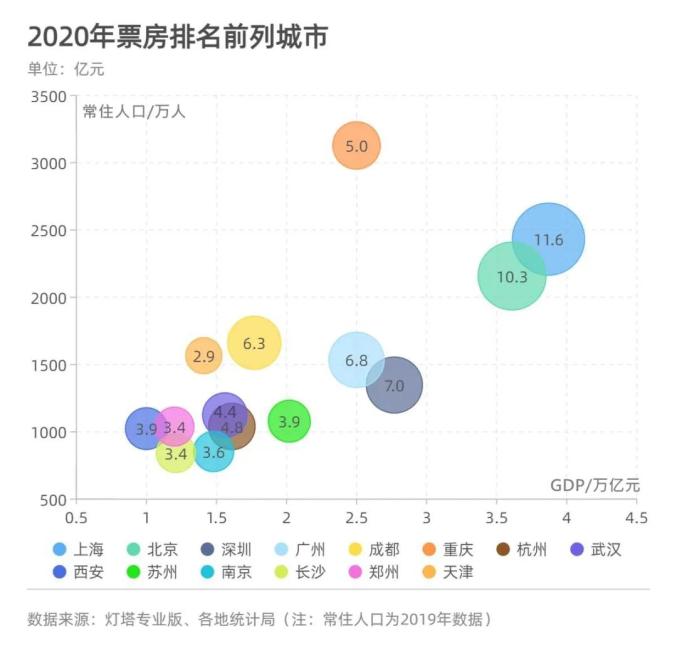 西安的电影票房表现则让人意外。相比其他票房排名靠前的城市,西安在2020年刚刚迈进GDP“万亿俱乐部”,常住人口总量也刚刚突破千万,但总票房排名一路向上,挺进前十。