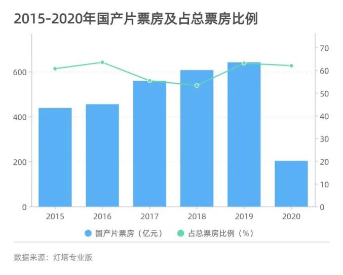 与国产片上映数量齐头并进的,还有影片质量,这直接体现在票房成绩上。2015年至2020年,国产片票房一路走高,在全年总票房占比也从2019年起稳定在60%以上。