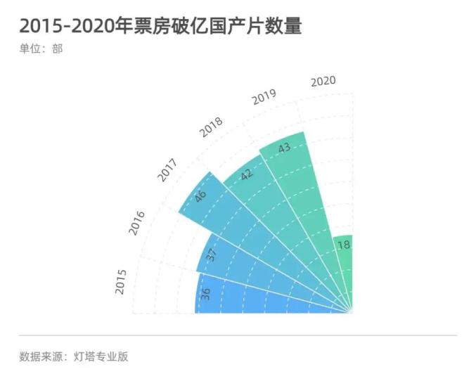 “一日游”影片逐渐减少,票房过亿的国产片突飞猛进,从2015年到2020年,分别为36部、37部、46部、42部、43部和18部。而票房超10亿元的国产片数量也在节节攀升,从2015年到2020年分别为5部、5部、6部、8部、11部和6部。