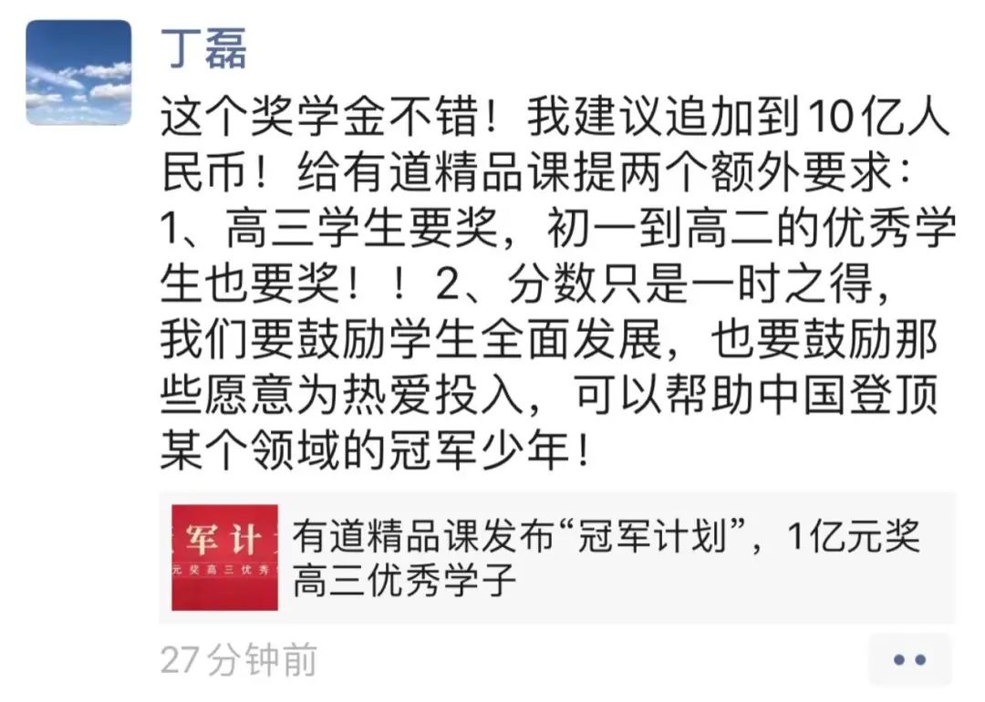 随后在3月26日,丁磊发朋友圈宣布,加码网易有道精品课推出的“冠军计划”,设10亿元奖学金,并额外提出将范围扩大到全国初一到高二的优秀学生,同时还要“鼓励为热爱投入,可以帮助中国登顶某个领域的冠军少年。”