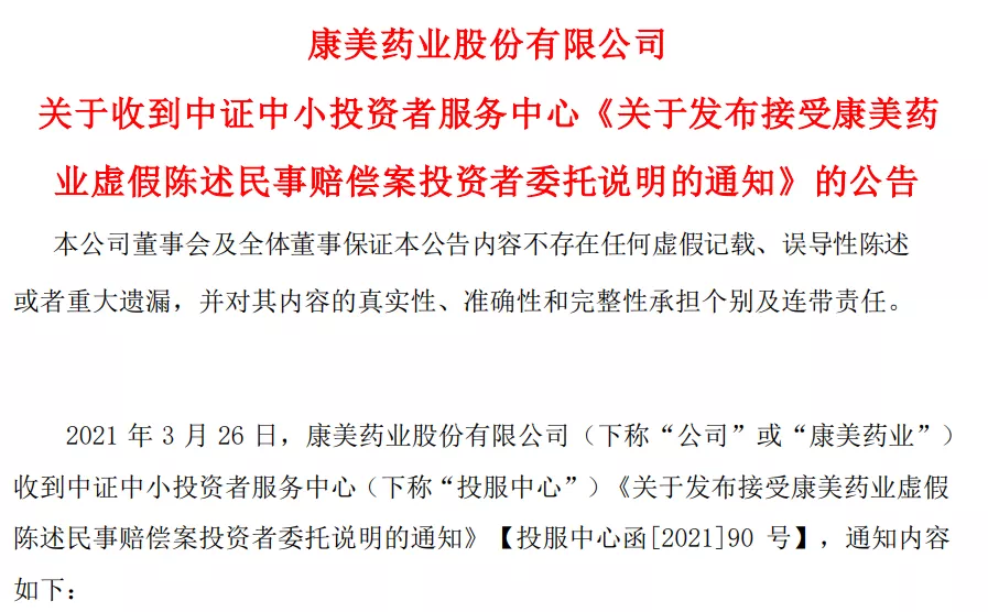 3月26日,投资者起诉康美药业虚假陈诉责任纠纷案件取得新进展,投服中心也正式接受投资者委托替投资者打官司。
