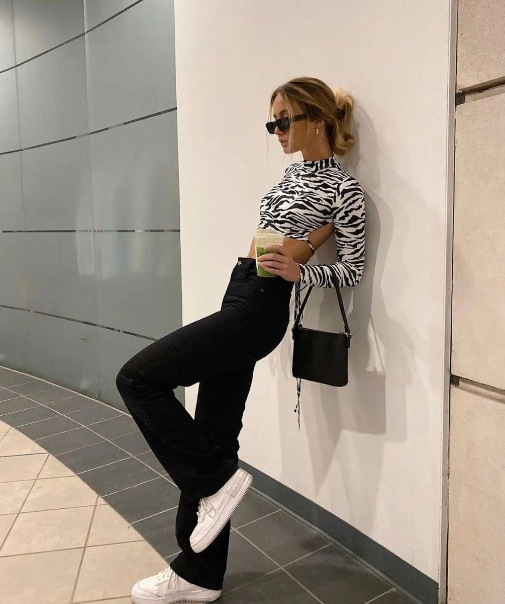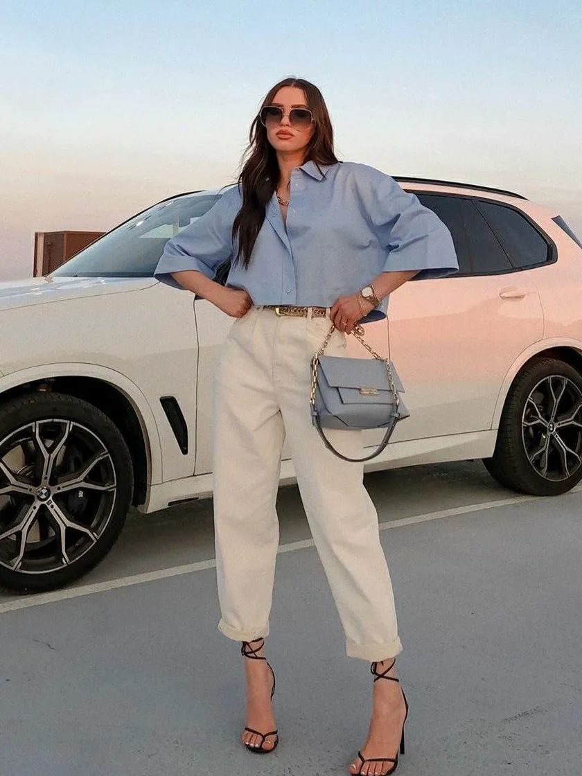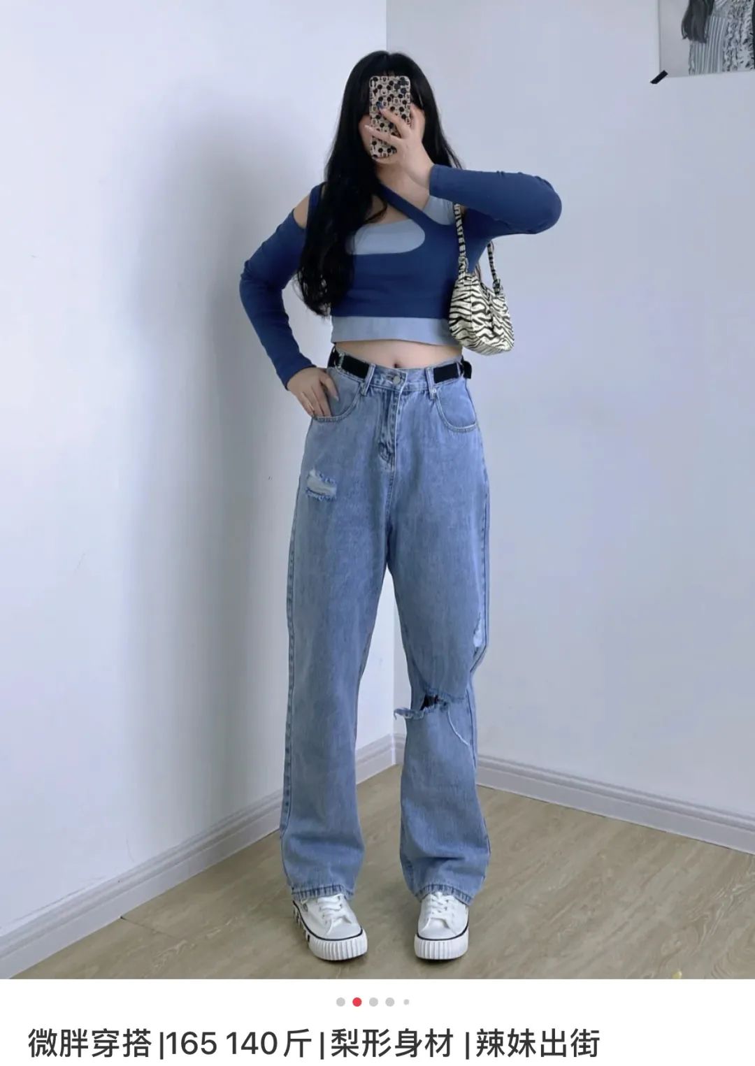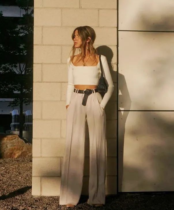 下装还是首选高腰裤,即使天生比例不佳,短上衣+高腰裤的搭配,也能让你轻松穿出超模腿~