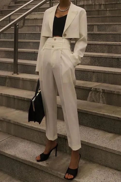 短上衣+高腰裤,最时髦的穿法,让女生自信的展示自己,还能拥有逆天比例,即使是小个子也能穿出显高的视觉效果。