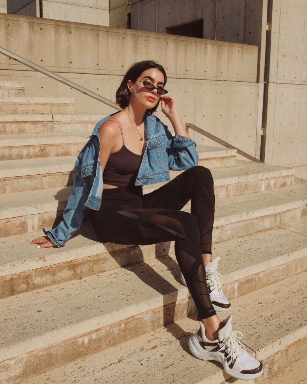 牛仔外套选择短款会更chic哦,内搭吊带或短衫,配紧身裤、牛仔裤都超可的~