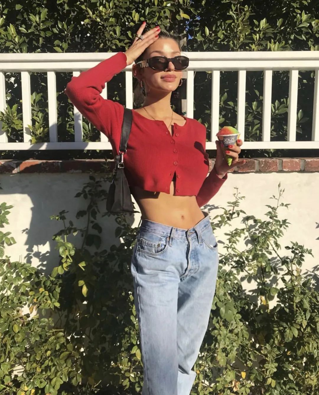 GiGi拿红色吊带配短款牛仔外套,就很有复古氛围美;直接穿件短白T出门,不用考虑搭配问题,简单又时髦~