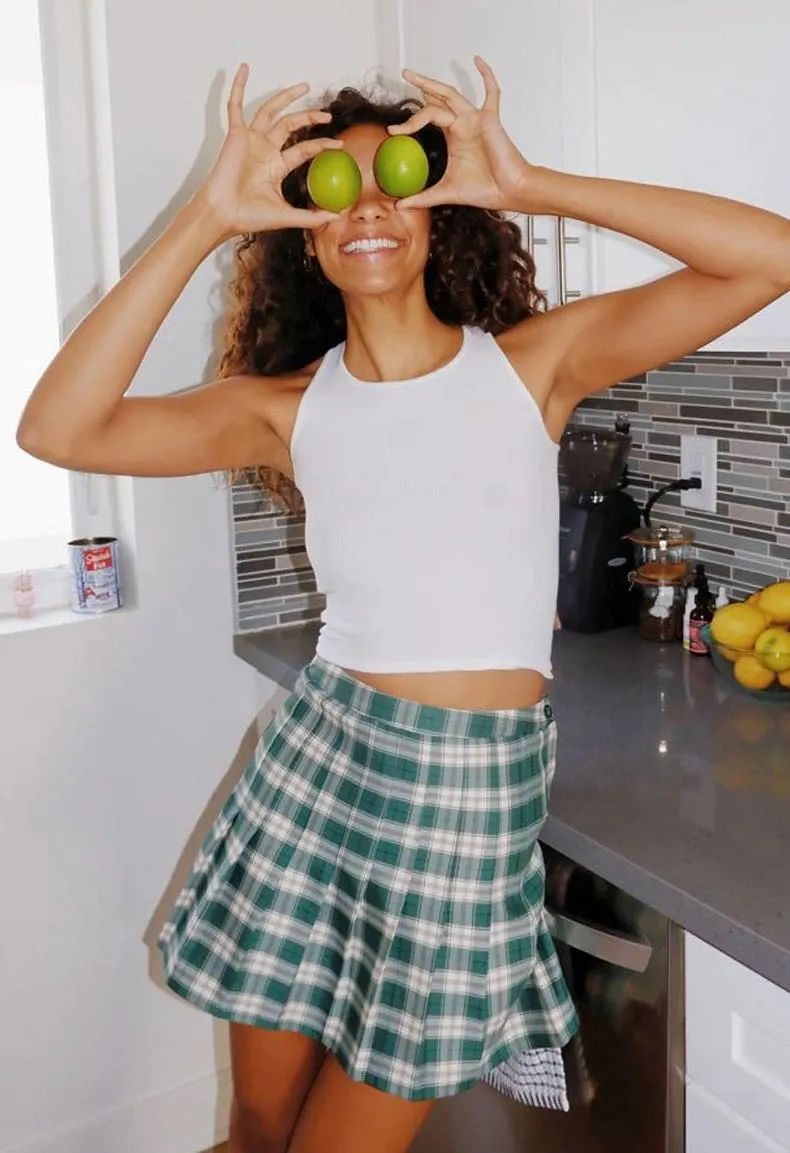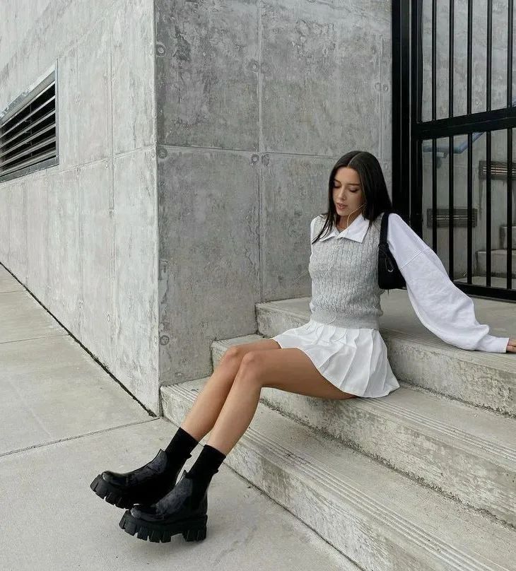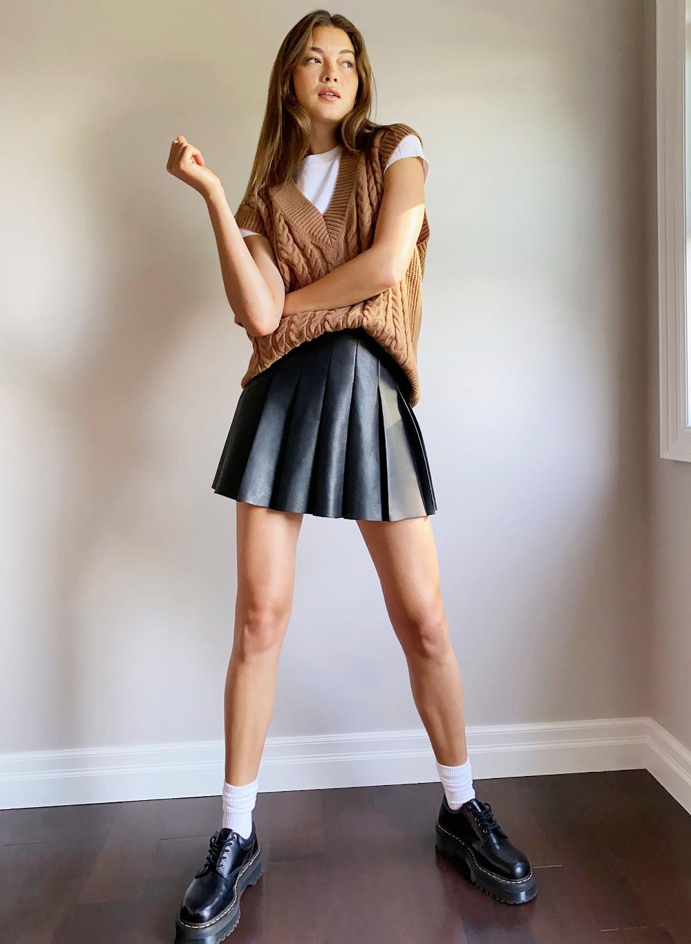 想秀出大长腿的仙女,选一条高腰短裙就可以了,搭配针织马甲,还能营造出学院减龄风~