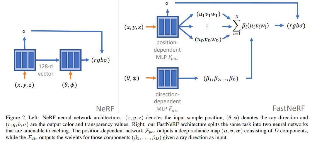 左:NeRF 神经网络架构;右:FastNeRF 架构。