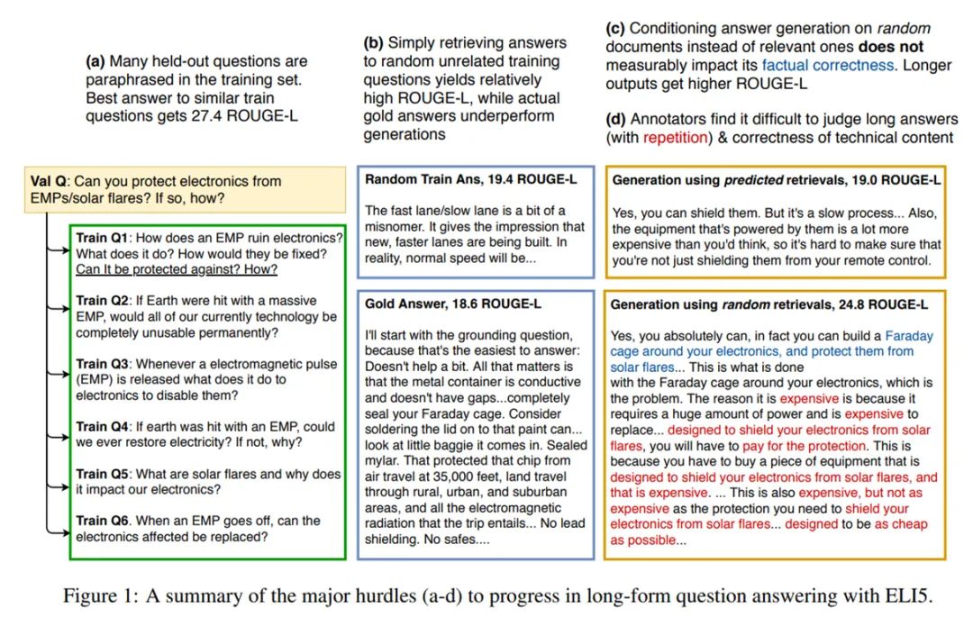 ELI5 数据集上的性能上 / 下限。推荐:本文探讨了阻碍长篇问答模型的主要问题,对该领域取得进一步进展非常有意义。
