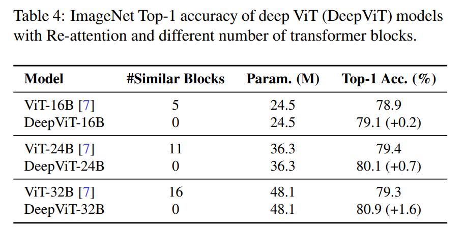 不同 transformer 块数量下,具有 Re-attention 的 DeepViT 模型的 ImageNet Top-1 准确率。推荐:当使用 32 个 transformer 块训练 DeepViT 模型时,ImageNet 数据集上 Top-1 分类准确率提高了 1.6%。