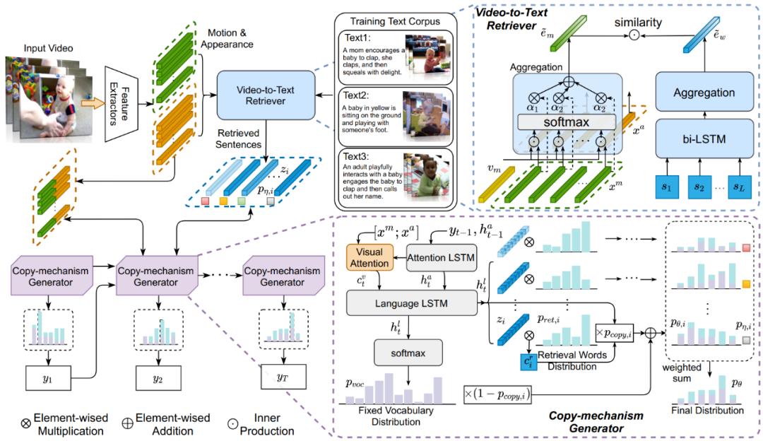 摘要:视频描述相对来说是一个高层的复杂任务,不同的人对同一个视频的描述也不尽相同。这一复杂任务可以借助内部知识或者外部知识来辅助生成。来自中科院自动所视频内容安全团队和腾讯 PCG 应用研究中心(ARC)的研究者提出了一种称为开卷视频描述(Open-book Video Captioning)的解决思路。该工作借鉴人类在写作或者回答问题的时候,往往会根据已有的知识和记忆,借助外部的资料进行查询,从这些相关的资料中总结或者摘抄文字作为问题的答案。这与最近在自然语言处理领域很火的「开放域问答(Open-domain Question Answer)」的相关研究具有异曲同工之处。