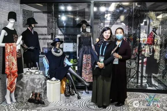 曾丽(左一)在进博会贵州展馆没有文字的苗族,却创造了苗绣这一“无字天书”。在过去,一个又一个不同的苗绣图文,和刺绣工艺及缤纷色彩在一起,组成苗族服饰;如今,它们成为设计元素,成为传统却又当代、有着肉眼可见的美,却又充满欲说还休的“神秘世界”。