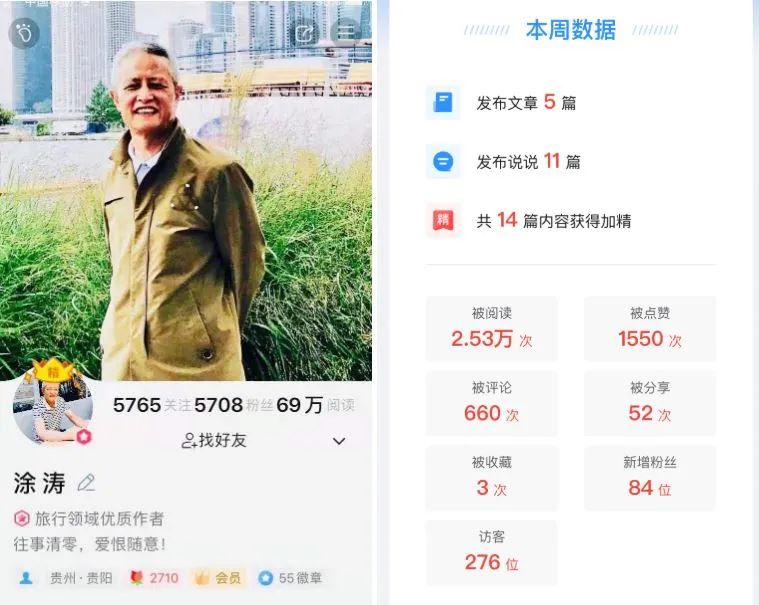 涂涛对数据上的成就颇为自豪,和在简历上堆叠辉煌战绩的新媒体小编并无两样。根据他的汇总,退休后入驻美篇的3年多来,他一共做了作品500多篇,其中450多篇首推并加精,包括文章90多篇、说说360多篇,获得了徽章55枚,粉丝5千多人,阅读量70多万。