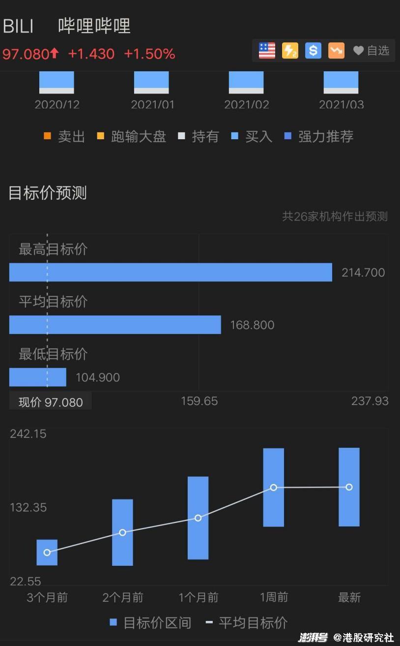 事实上,B站自2018年登陆美股后便得到资本持续看好,上市至今的涨幅已逼近900%。特别是在2020年,即便是亏损同比扩大,累计涨幅仍高达360%。在富途上,目前有26家机构对B站目标价做出预测,最高目标价为214.7美元,相较于目前的97.08美元仍有翻倍的上升空间。