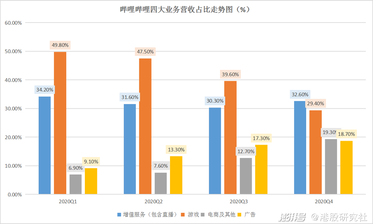 游戏业务方面,2020年Q4对总营收的贡献虽下降至29.43%,但也体现了B站在多元化营收上所取得的进展。不过,值得注意的是,这一业务在增速方面确有放缓,但有一个积极的信号便是B站内部已经在加快自研游戏的步伐。长期来看,基于目前B站的年轻用户群体是有望建立起自身护城河的。