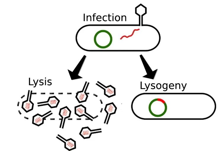 怎么回事呢?首先得了解病毒是怎么在人体内“生活”的。它们在成功打入内部后有两种选择,一种是溶原,将自己的基因隐藏在宿主的细胞内,先卧底下来修理整顿,也就是我们所说的潜伏期。我们基因组中就有很多病毒潜伏留下来的痕迹。