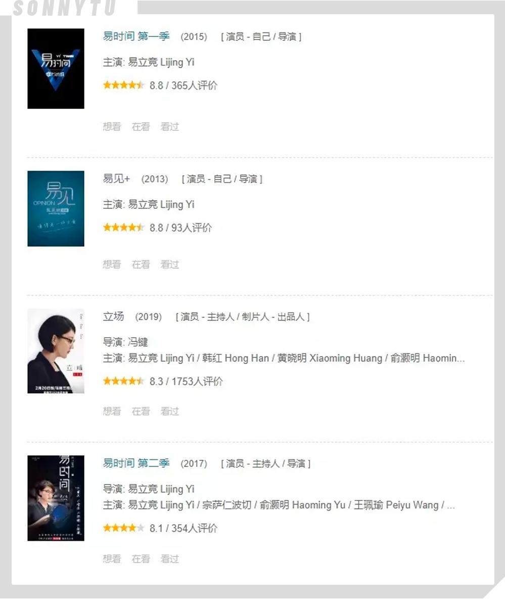 那些年她做过的访谈节目,《易见+》《易时间》《立场》《定义》等,豆瓣评分均在8分以上。