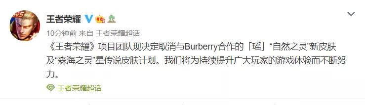 3月17日,《王者荣耀》官宣与Burberry跨界联动,以“自然之灵”为主题,推出游戏角色“瑶”的两款传说级别的新皮肤。然而官宣刚刚过去一周,《王者荣耀》官方微博再次宣布:取消这次跨界合作皮肤计划,并表示“将为持续提升广大玩家的游戏体验而不断努力。”