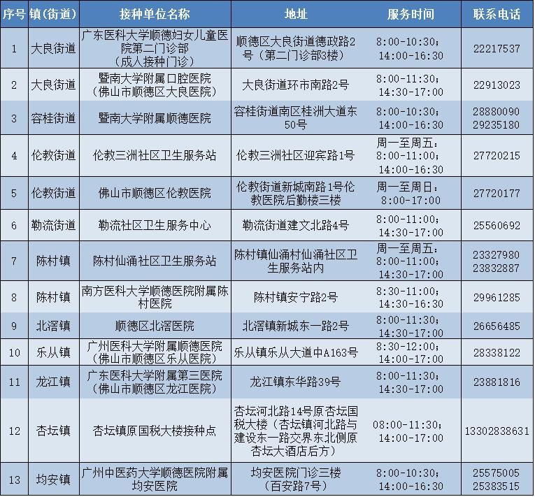 (点击查看大图)除了以上13家接种门诊外,顺德将陆续开放多个临时接种点。市民可以通过电话咨询就近接种点进行预约,也可通过集体单位、居住地村(居)委会预约接种。预约成功后,请市民接到通知后按照预约时间到指定地点进行接种。