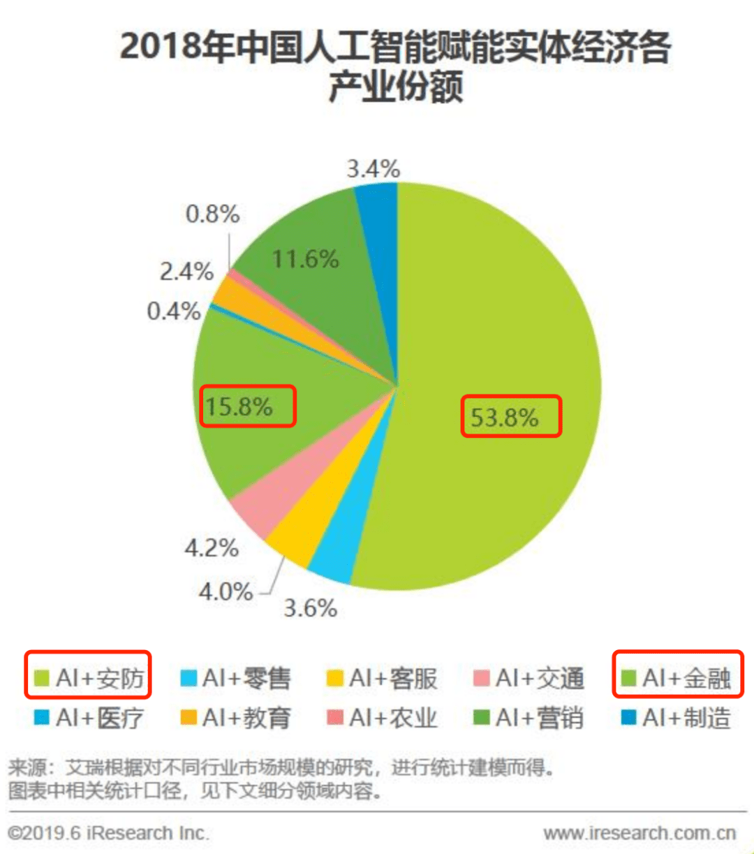 据艾媒咨询发布的《2019年中国人工智能产业研究报告》,安防和金融领域成为人工智能赋能实体经济市场份额最多的两大领域,占比分别为53.8%、15.8%。也就是说,安防是兵家必争之地。