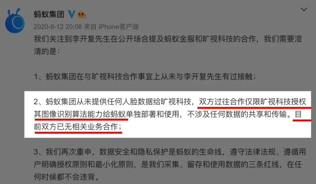分手故事早已上演,去年,在澄清李开复关于蚂蚁金服为旷视提供人脸数据的“口误”时,蚂蚁金服透露,支付宝刷脸支付早已不再与旷视合作,双方当年的合作仅限旷视授权其图像识别算法能力给蚂蚁单独部署与使用,蚂蚁没有将任何数据给旷视。