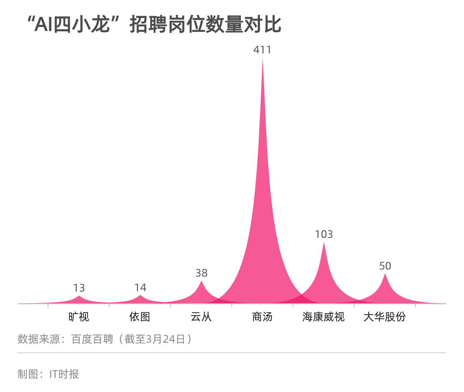 不过,“AI四小龙”放出的招聘岗位数量拉开了差距,在百度百聘聚合招聘平台上,截至3月24日,旷视、依图、云从的招聘岗位数量分别为13、14和38个,唯独没有公布具体上市时间表的商汤放出了411个招聘岗位。